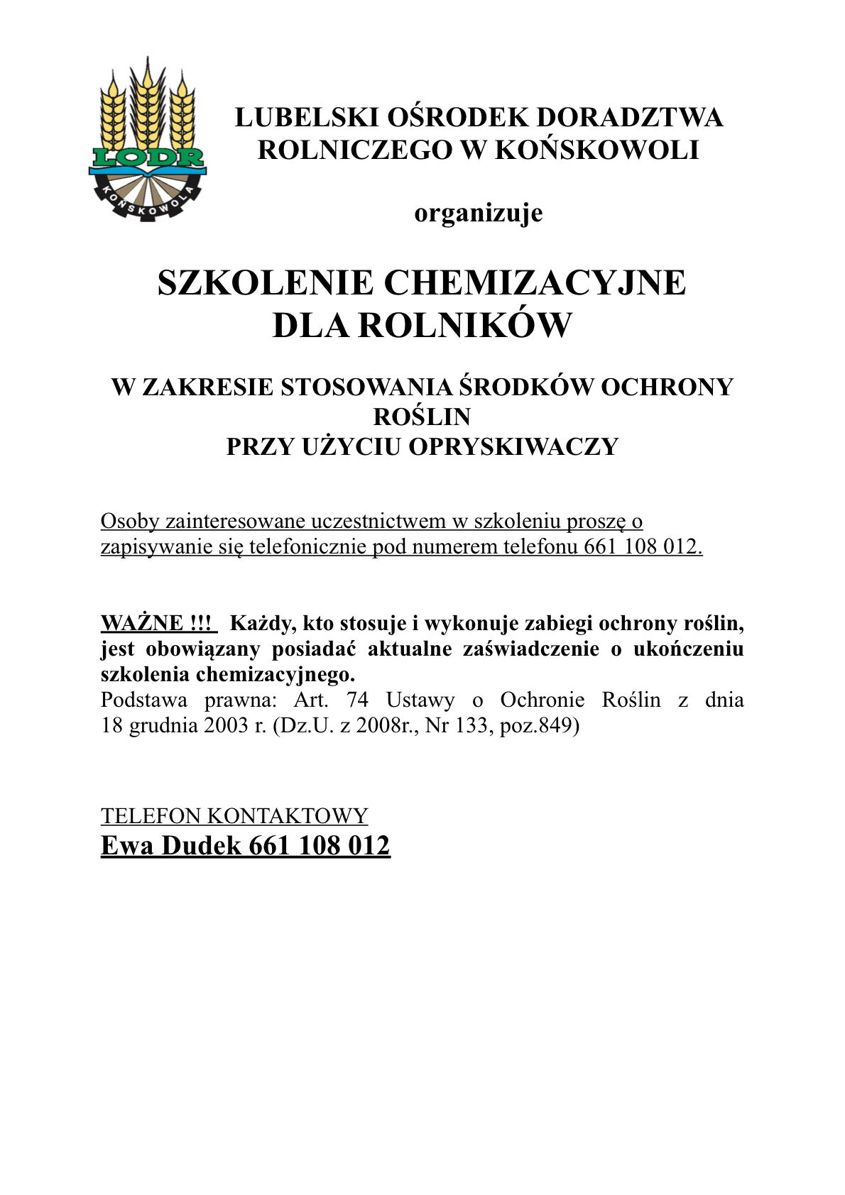 LUBELSKI OŚRODEK DORADZTWA ROLNICZEGO W KOŃSKOWOLI organizuje SZKOLENIE CHEMIZACYJNE DLA ROLNIKÓW W ZAKRESIE STOSOWANIA ŚRODKÓW OCHRONY ROŚLIN PRZY UŻYCIU OPRYSKIWACZY
